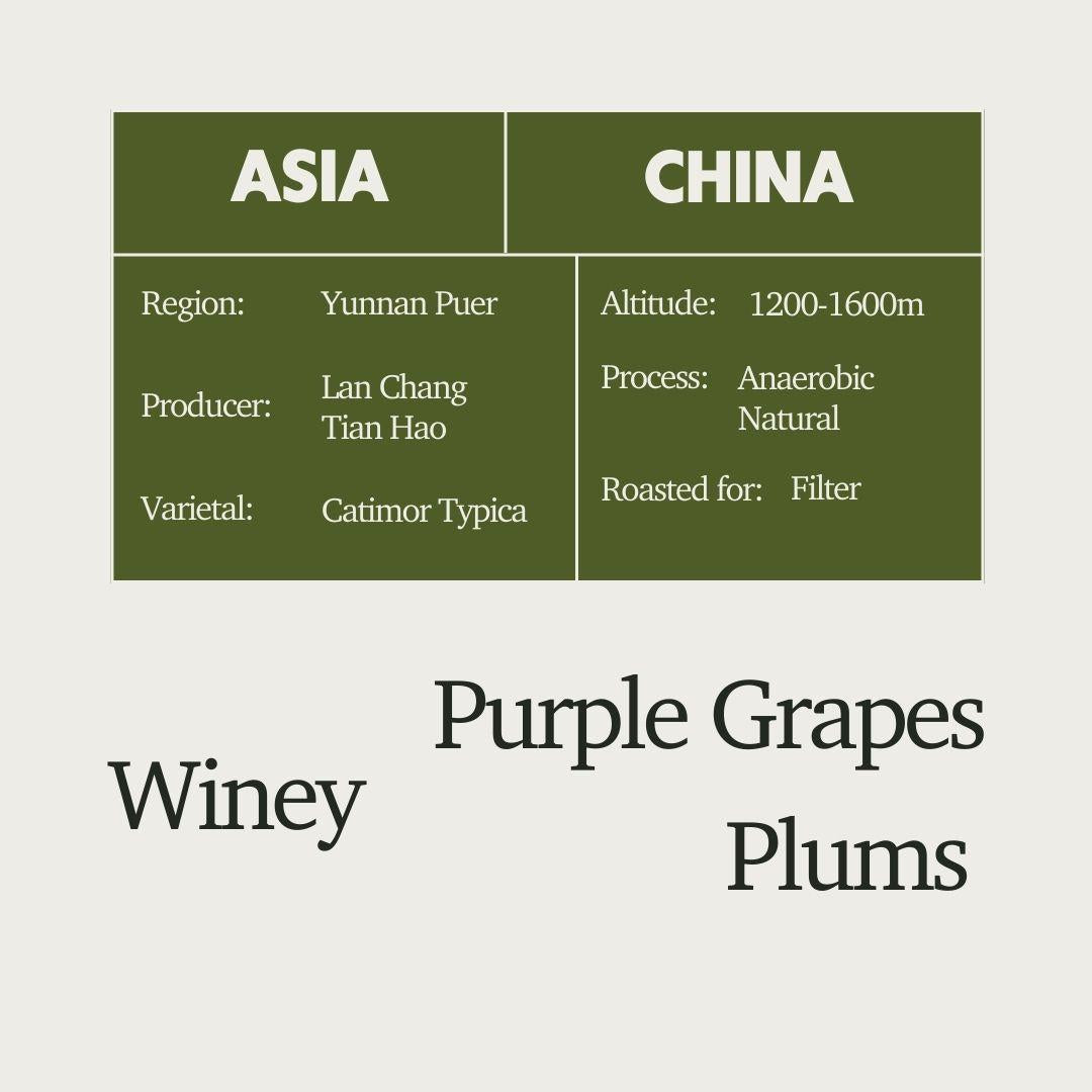 There isn’t much information available about this particular lot, but what we do know is that China is an up-and-coming coffee-producing origin. We’ve long wanted to introduce Chinese coffees into our offerings, though many didn’t quite align with our profile. This coffee from Tianhao Plantation in Lancang stands out. Tianhao produces over 90% of China’s coffee, and this anaerobically processed lot brings added complexity to the cup. Expect winey, grapey notes with a funky edge. If you enjoy adventurous, expressive coffees, this one is right up your alley.
