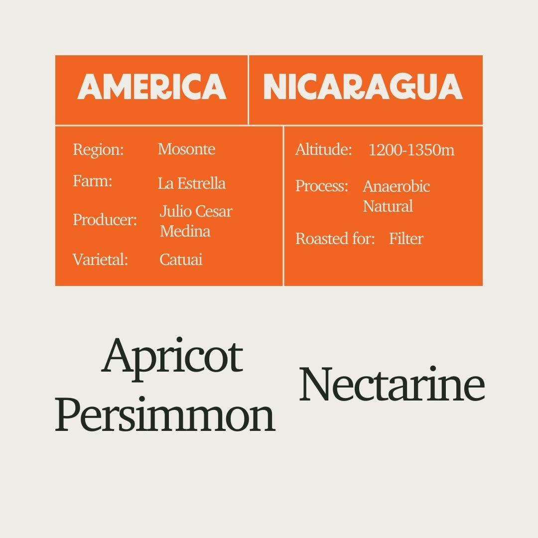 This month, we’re offering coffees with bright, fruity sweetness, and this Nicaragua from Finca La Estrella fits the profile perfectly. Founded by Julio Cesar Medina and passed down through his family, the farm is ideally located on hillside terrain with optimal temperatures and rainfall for healthy coffee growth. Forest trees provide natural shade, protecting the cherries from excessive sun exposure and helping ensure consistent quality. This lot is processed using the anaerobic method, further enhancing its sweetness and complexity, resulting in a cup that’s vibrant, expressive, and deeply satisfying.