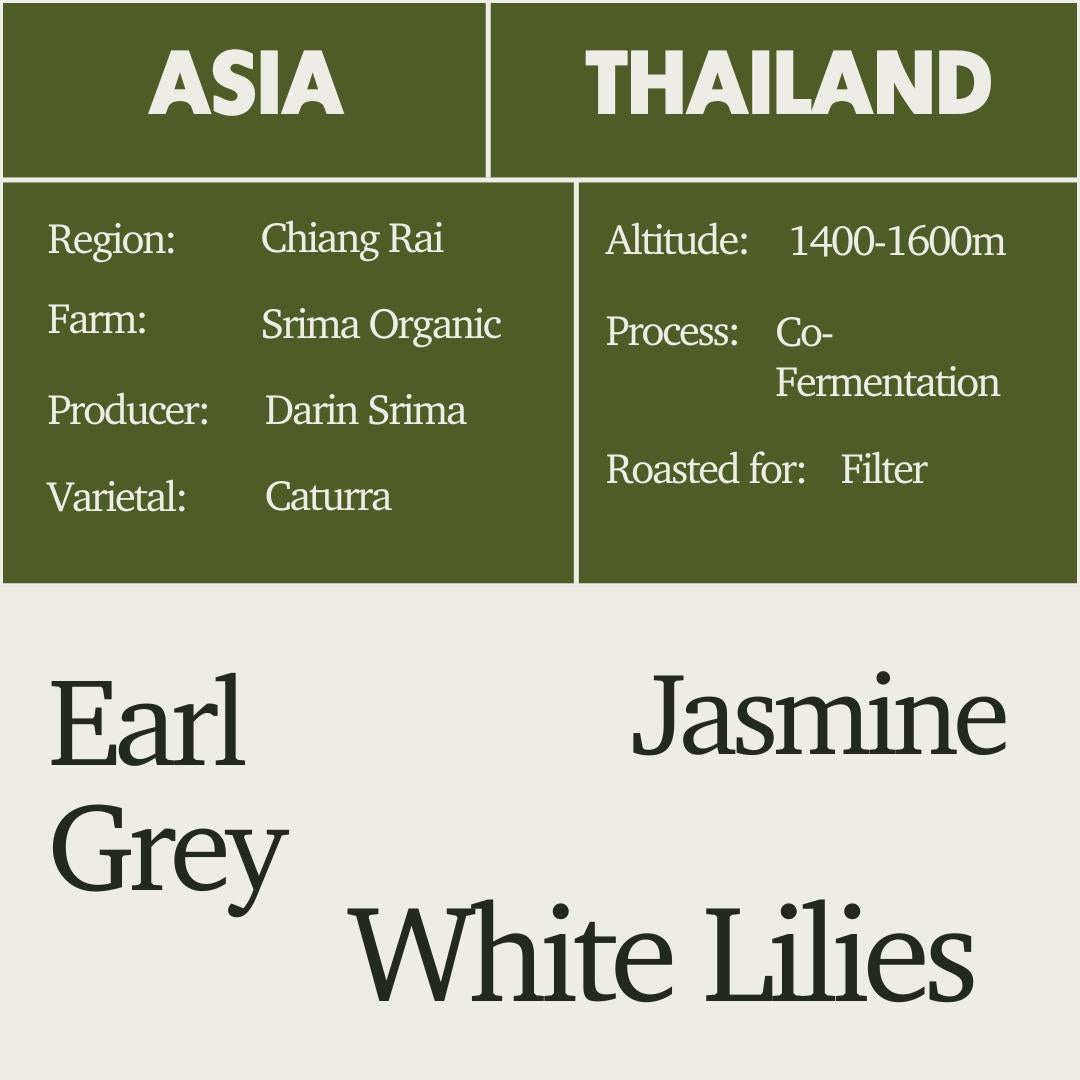 For our Asia region filter offering, we have selected a Caturra variety from Srima Organic Farm, located in the highlands of Chiang Rai, Thailand. This lot underwent a co-fermentation process, a process where the coffee cherries are fermented alongside a natural yeast culture derived from orange blossoms. The result is a sweet cup with a pronounced white floral aromatics, tea-like body, and a soft, lingering finish. By featuring this coffee, we hope to highlight an alternative to conventional coffee fermentation techniques, the potential of co-fermentation to present both clarity and also complexity in the cup, and to celebrate innovation done with intention.